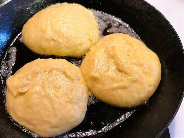 十分温まったら1/3量の生地を入れます。とろ火のまま蓋をして焼き色がつくまで3分焼きます。