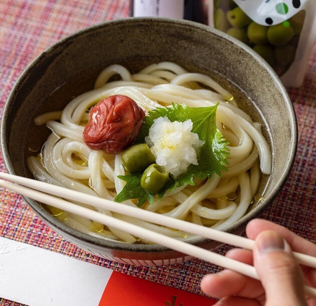 純白の讃岐うどんに新春を祝う紅の梅干しと白の大根おろし、小豆島産の新漬けオリーブをのせて。
