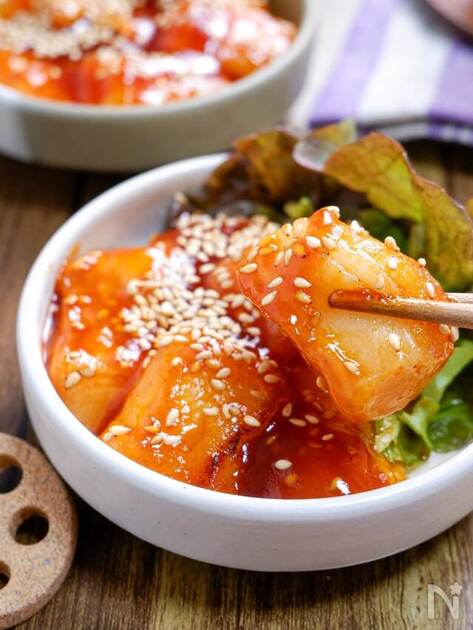 こってり甘辛いたれをつやつやに絡めたトッポギ風おつまみ。お餅と調味料のみで、ぱぱっと10分で作れます。韓国風の一品でお酒を楽しみたい日にいかがですか?