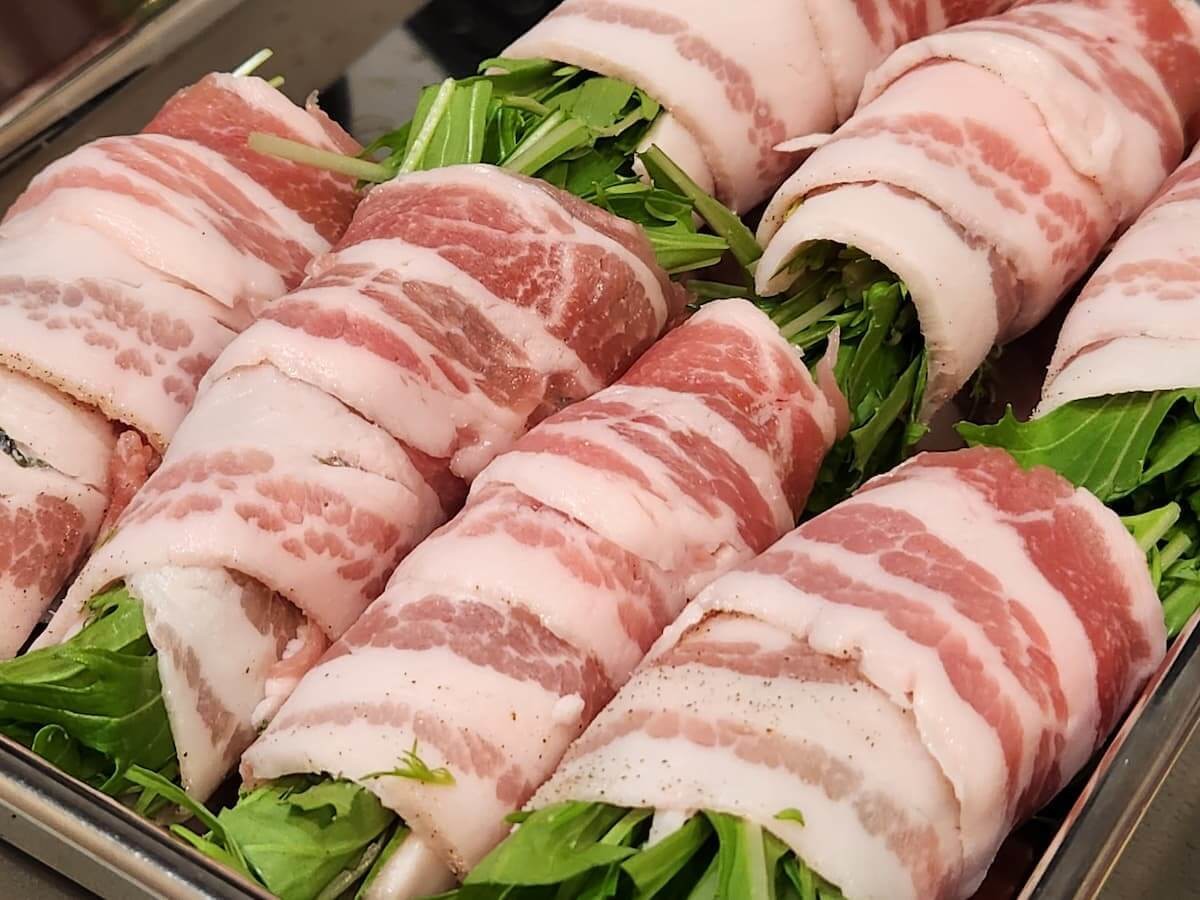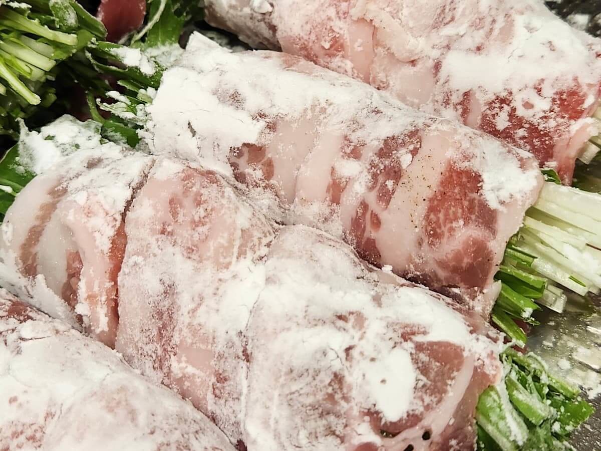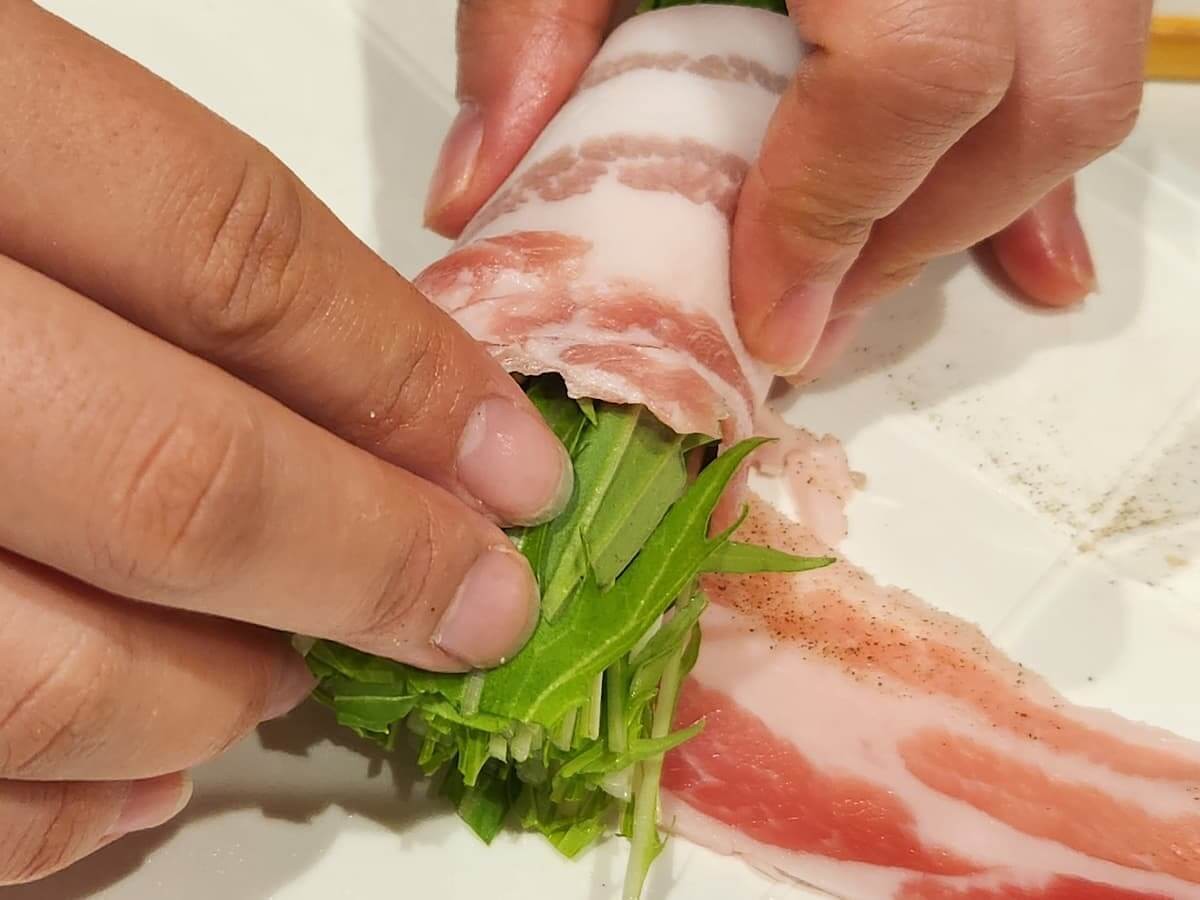 作り方③水菜に豚バラ肉を巻きつける