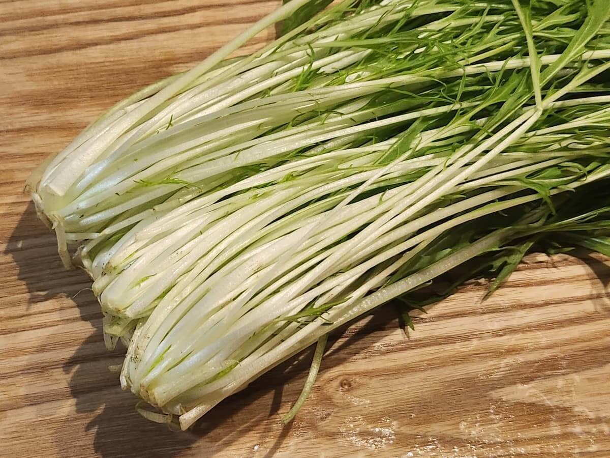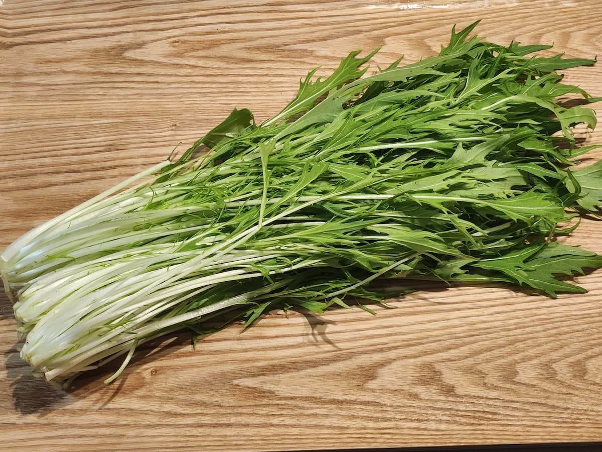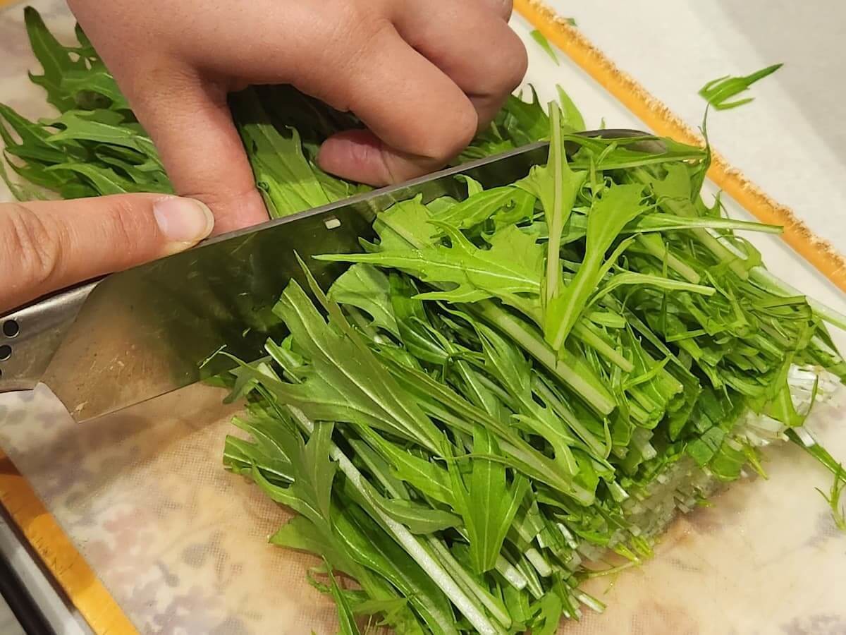 水菜をよく洗い、根元を切り落として食べやすいサイズにカットします。