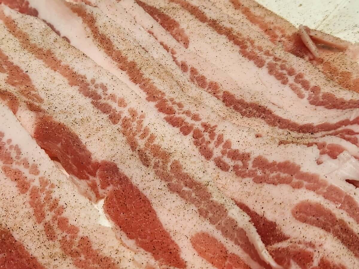 豚バラ肉を広げ、片面に塩・こしょうをかけます。