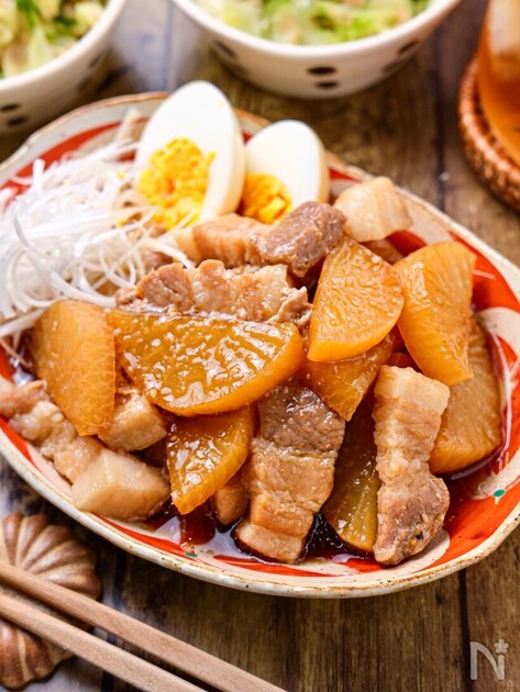 甘辛くこってり仕上げた豚バラ大根です。大根はレンチンしてから煮込むことで煮込み時間が短くなり、おまけに味が染みこみやすくなるメリットも。ごはんのお供に最適な一品です。