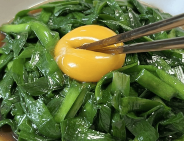しっかり和えて中華風タレを含んだニラと、黄身を一緒に食べるともう絶品です。