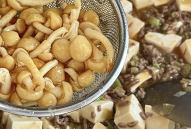 普段ならここで麻婆豆腐の完成ですが、今回のレシピでは仕上げに"なめこ"を投入!