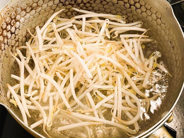 もやしを熱湯で30秒ほど茹でます。茹でたら、お湯は捨てずにもやしだけを取り出してください。