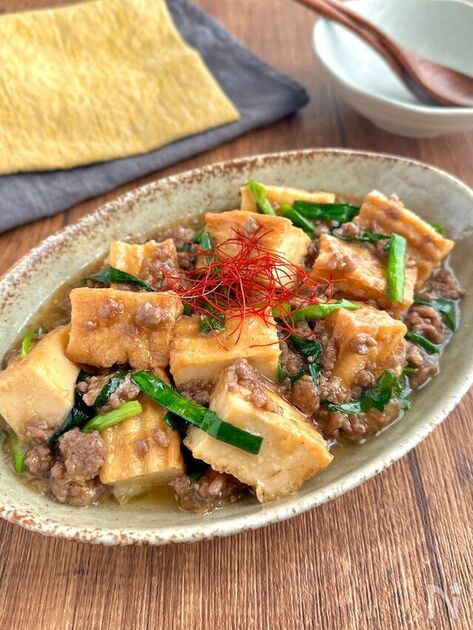 手早く作れて食べ応えもバッチリな和風麻婆厚揚げです。和風な味付けがほっこりとおいしく、大人から子供まで幅広い世代で楽しめる一品です。