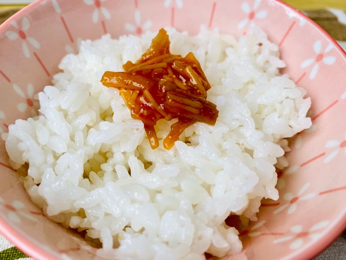 ピリ辛明太子のプチプチ間とエノキの歯応えと甘味が病みつきになること間違いなし。明太子やエノキが好きな人は大体が好きになること間違いなし♪