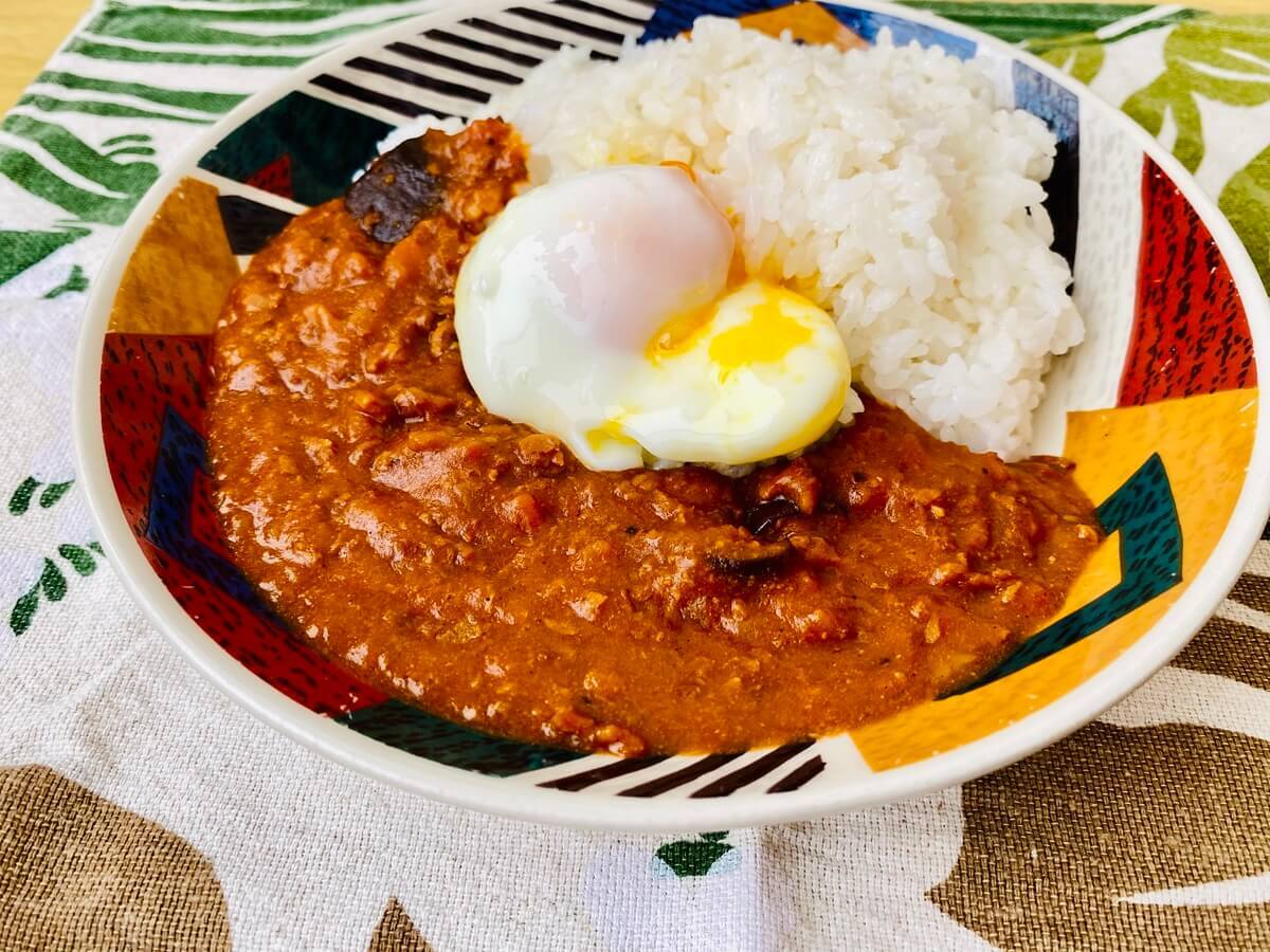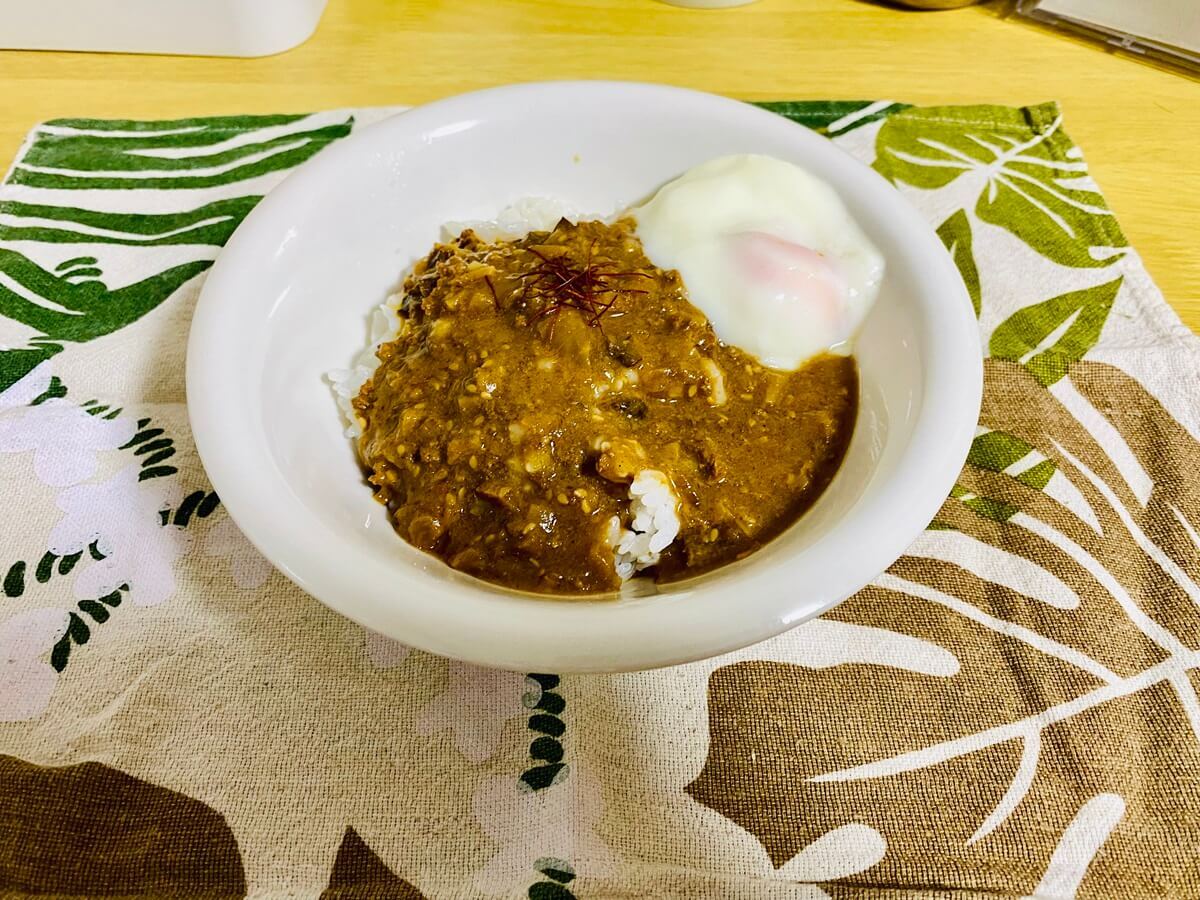 絡みの中に旨みがあり、具材もゴロっと入っているため満腹感強めの1品でした。筆者はキーマカレーの上に写真と同様温泉卵を作って乗せて食べるのが大好きです!