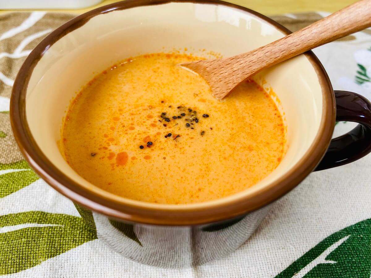 個人的な食べ方ですがコショウを入れて食べるのと入れないのとでは変わるのでオススメです。若干ですがトマト強めのビスクです!