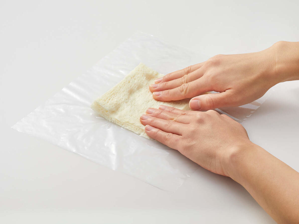 (1)食パンの耳を切り落とし、「サランラップ®」を広げた上にのせる。スプーンの背などで水を全体に塗って裏返し、手でパンの厚みをつぶす(特に四すみはていねいに行う)。