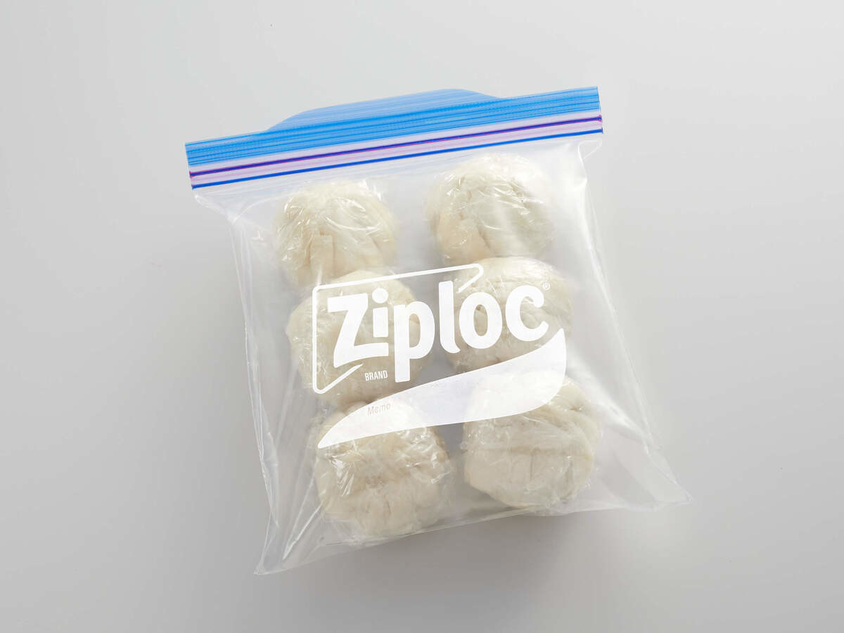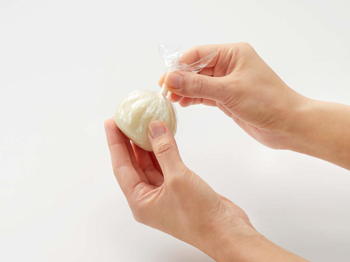 (3) 「サランラップ®」で茶巾絞りのように包み、上部をしっかりとひねって、肉まんの形を作る。戻らないくらいに成形できたら、「サランラップ®」で包み直し、「ジップロック®フリーザーバッグ」に入れる。