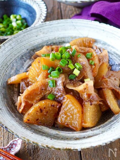 大根に豚バラの薄切りを巻き付けて、甘辛い味付けで煮詰めたらおいしさ満点!薄切り肉なのに角煮感覚で食べられて、ボリュームたっぷり。野菜が食べられてヘルシーで、冷凍保存もできるので便利。マヨや一味で味変させるのも◎。