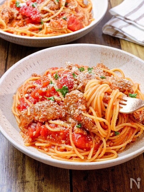 トマトとツナの旨味がギュッと詰まった絶品パスタ。フライパン一つで作ったとは思えない本格的な味わいで、一口食べたらハマるおいしさです。