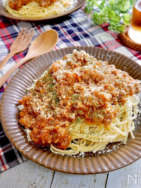 本格的なミートソースがレンジで作れるお手軽パスタ。玉ねぎと人参を細かく切ったら、具材の材料を混ぜてレンチンしていくだけ。茹でたパスタにたっぷりかけ、粉チーズを振ってお召し上がりください。