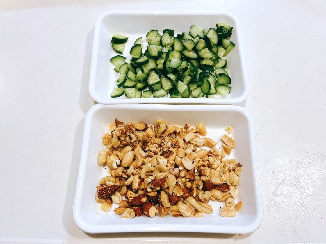 きゅうりはいちょう切りに、ミックスナッツは刻んでおきます。