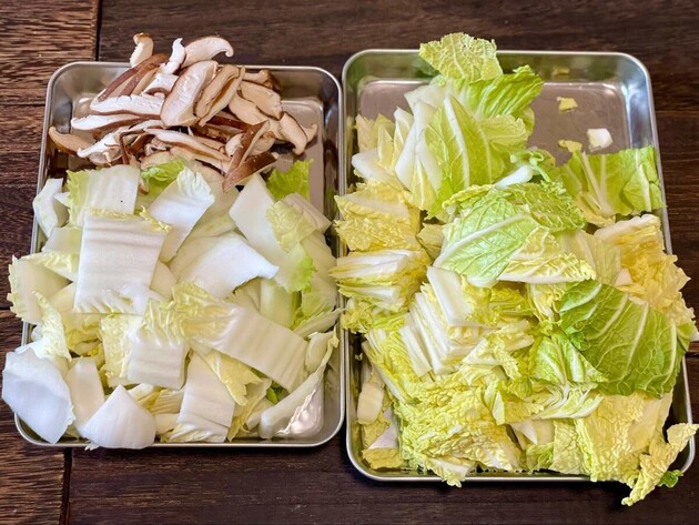 白菜は、葉の部分と軸の部分に分け、軸はひと口大のそぎ切りに、葉はざく切りにしましょう。