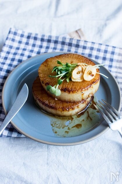 ⑨下ゆで不要!ガリバタ風味の大根ステーキ