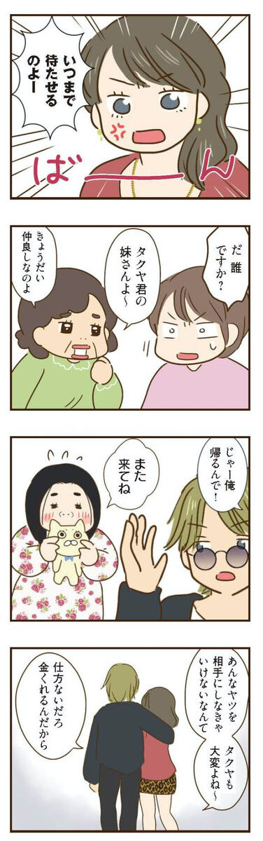 とんでもモンスターの義姉まりんの彼氏として登場したタクヤでしたが、まりんに暴言を吐いて部屋の掃除をさせ、しかもお金を渡されてホクホク。迎えに来た妹は、どう見たって妹ではないですよね……。