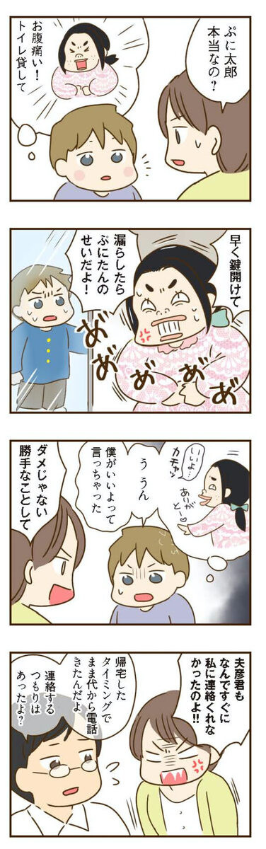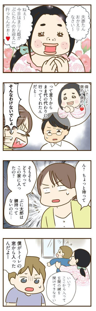 あの……まま代に頼まれてもないのに、保育園へ迎えに行って人の家にいたってこと……?しかも、ぷに太郎を使って不法侵入するなんて信じられない!!!