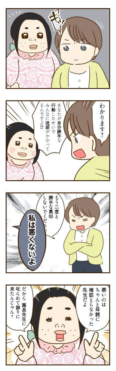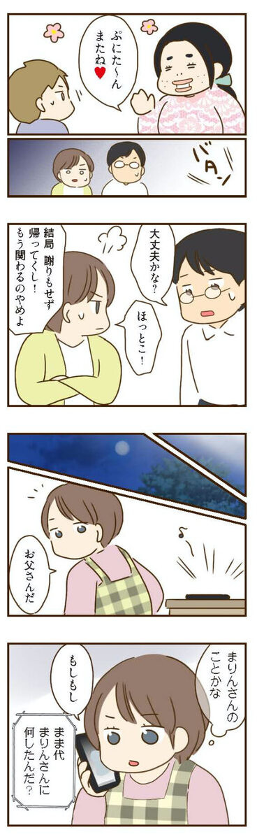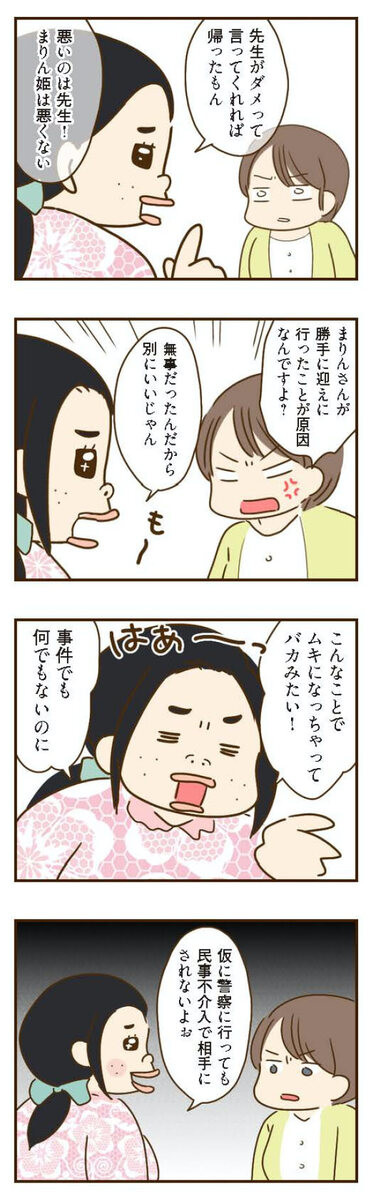 義姉のまりんが、まま代の息子ぷに太郎のお迎えに行ったせいで、保育園の園長や担任が謝罪に来て大ごとに。なのに「私は悪くない」の一点張りなんて、本当に信じられないですよね。