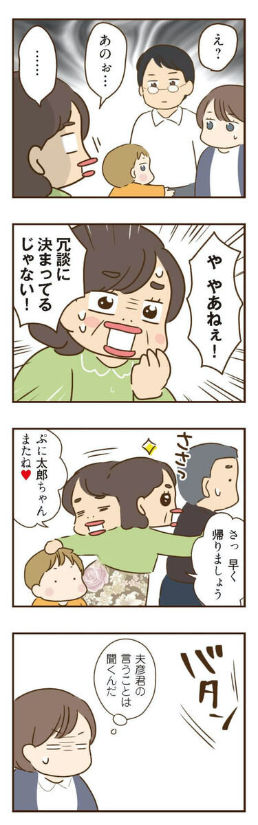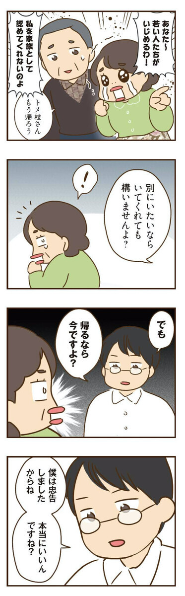 完全にトメ枝のペースに飲まれてしまう……と思ったその時、夫彦が帰ってきました!