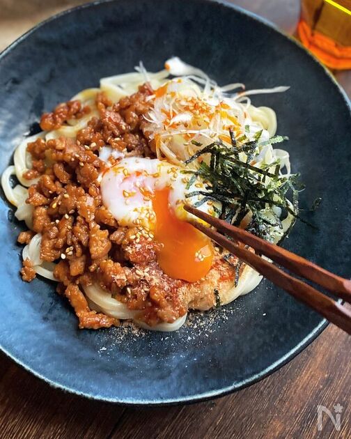 ピリリと旨辛い台湾風の混ぜうどん。温玉を乗せて釜玉風に仕上げますが、面倒なときは卵黄だけでもOKです。こちらのレシピは1人分の材料なので、人数に合わせて倍量以上で作ってくださいね。