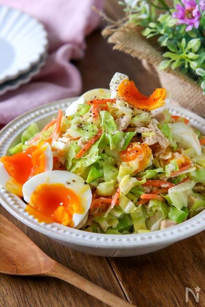 春キャベツにゆで卵とツナと人参を加えてヨーグルトマヨネーズで和えたヘルシーサラダ。キャベツを2分だけレンチンするので食感を残しつつ甘さもアップ。テーブルに出すときれいに映える素敵なサラダです。