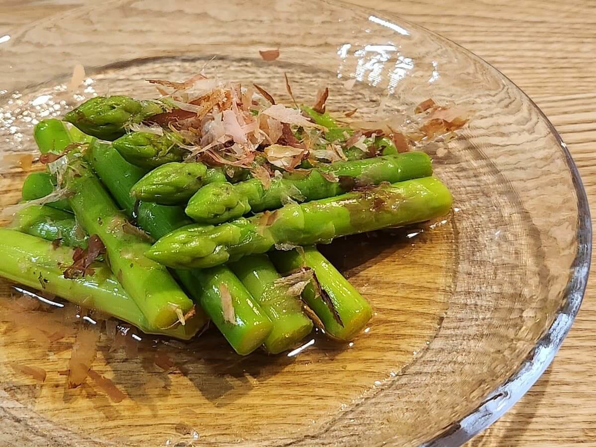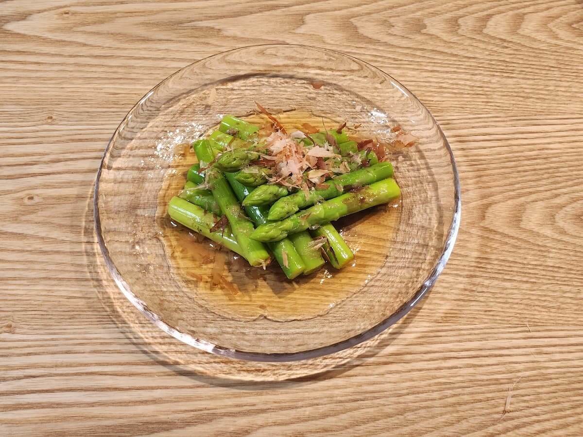 アスパラガスをお皿にうつして、鰹節をかけていただきましょう。
