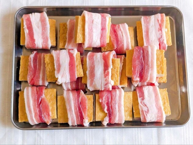 切った厚揚げを豚バラ肉で巻いていきましょう。