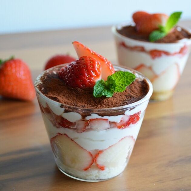 食パンに染み込ませたコーヒーがいい風味を演出してくれるいちごティラミス。スポンジを食パンで代用することで大幅な時間カット!ぜひ透明なグラスで可愛く盛り付けてくださいね。