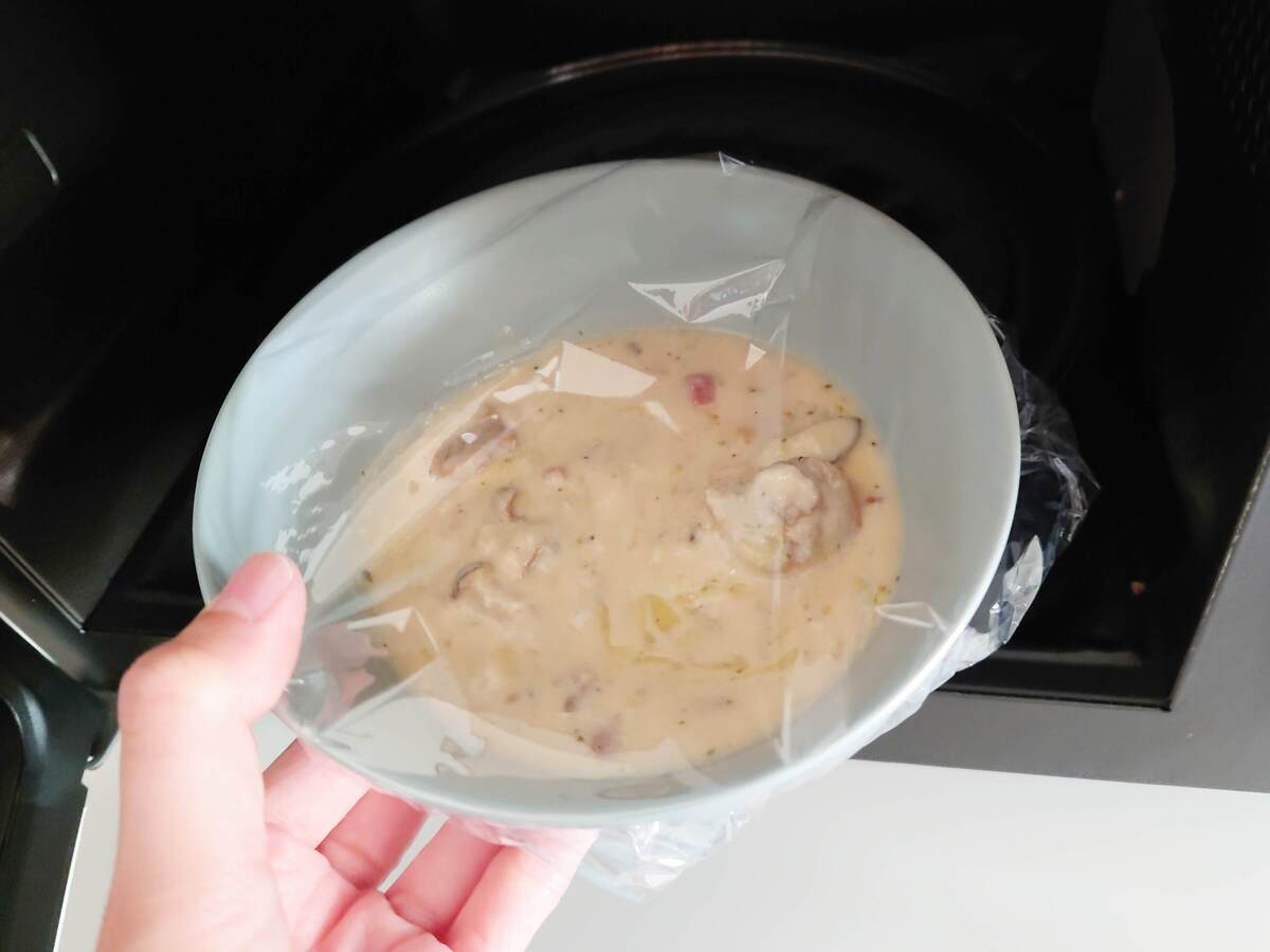 耐熱容器に入れラップをし、500Wで約1分温めます。沸騰したお湯で温める場合は、袋を開けずに約2分です。