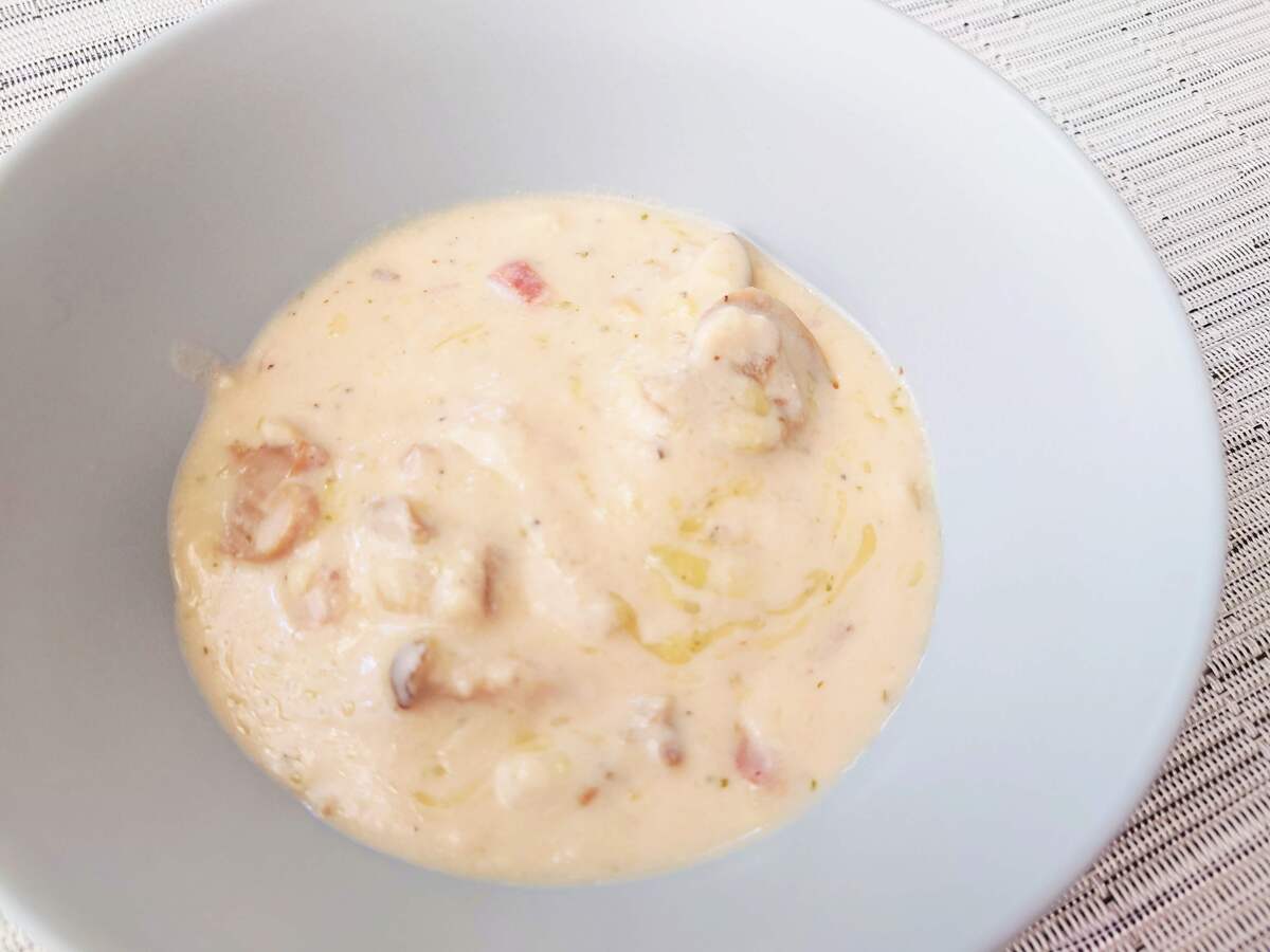 エリンギ、ぶなしめじ、マッシュルームの3種のきのこに白トリュフオイル、ベーコン、チーズ、にんにくペーストが入っています。チーズは24時間熟成したパルミジャーノ・レッジャーノ。クリームソースには、生クリーム、バター、牛乳を合わせてあります。