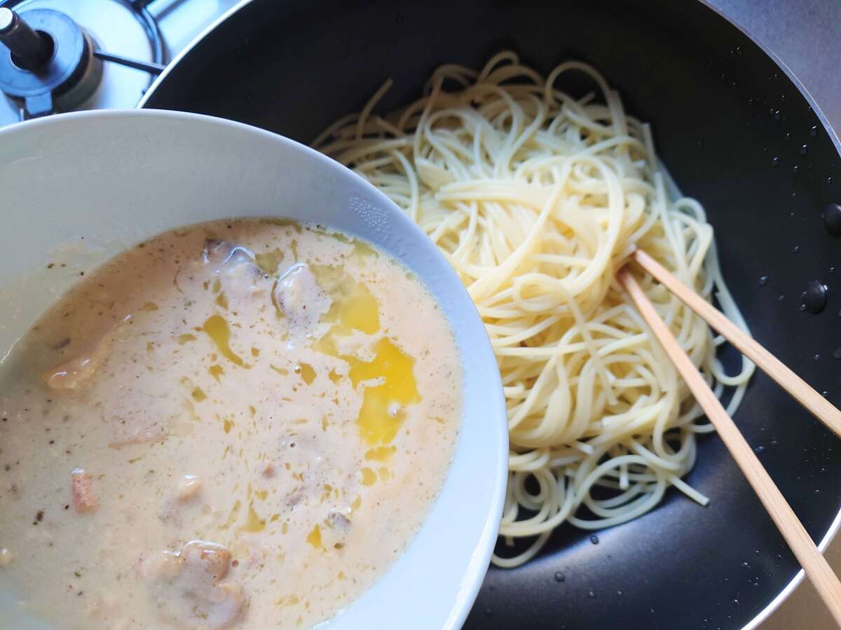 茹でたパスタに、ソースをかけて完成ですが、混ぜると、ソースが麺にからんでより一層風味を楽しめました。
