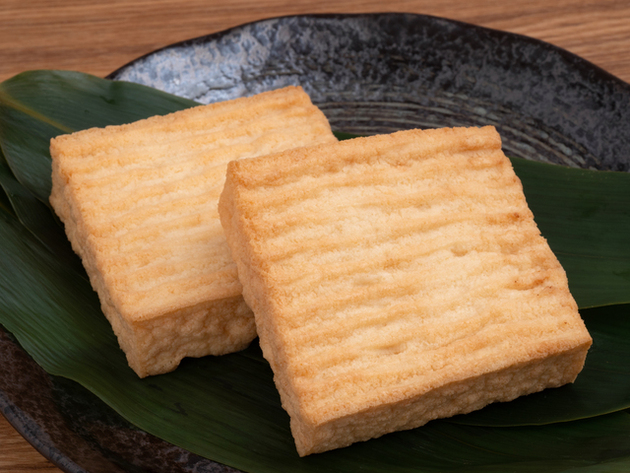 厚揚げを返して火を止め、小さいものは2枚1組にして並べます。