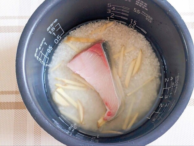 中央にブリの切り身をドーンと入れ、通常モードで炊飯してください。