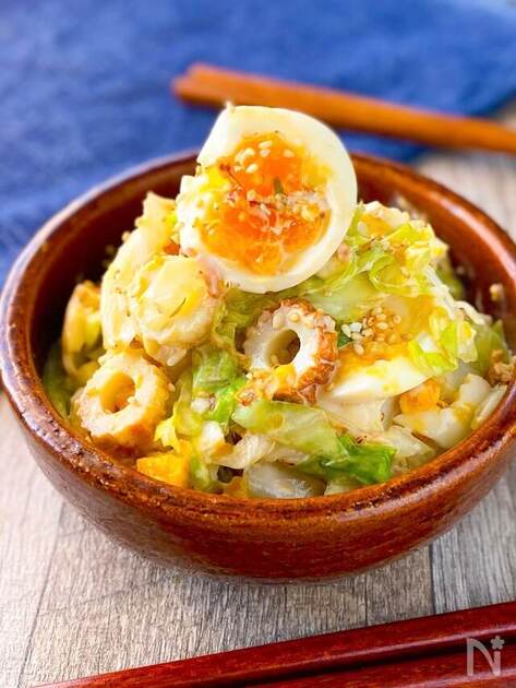 ちくわとゆで卵を入れてコクと旨みたっぷりに仕上げたキャベツサラダ。醤油入りの和風マヨネーズで全ての具材をおいしくまとめます。鰹節とごまの風味も豊かで、箸が止まらないおいしさ。
