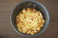 次に、水で溶いただしの素を注ぎフタをして10分ほど煮込んだら「時短北斗流そぼろきんちゃく」の完成です♡