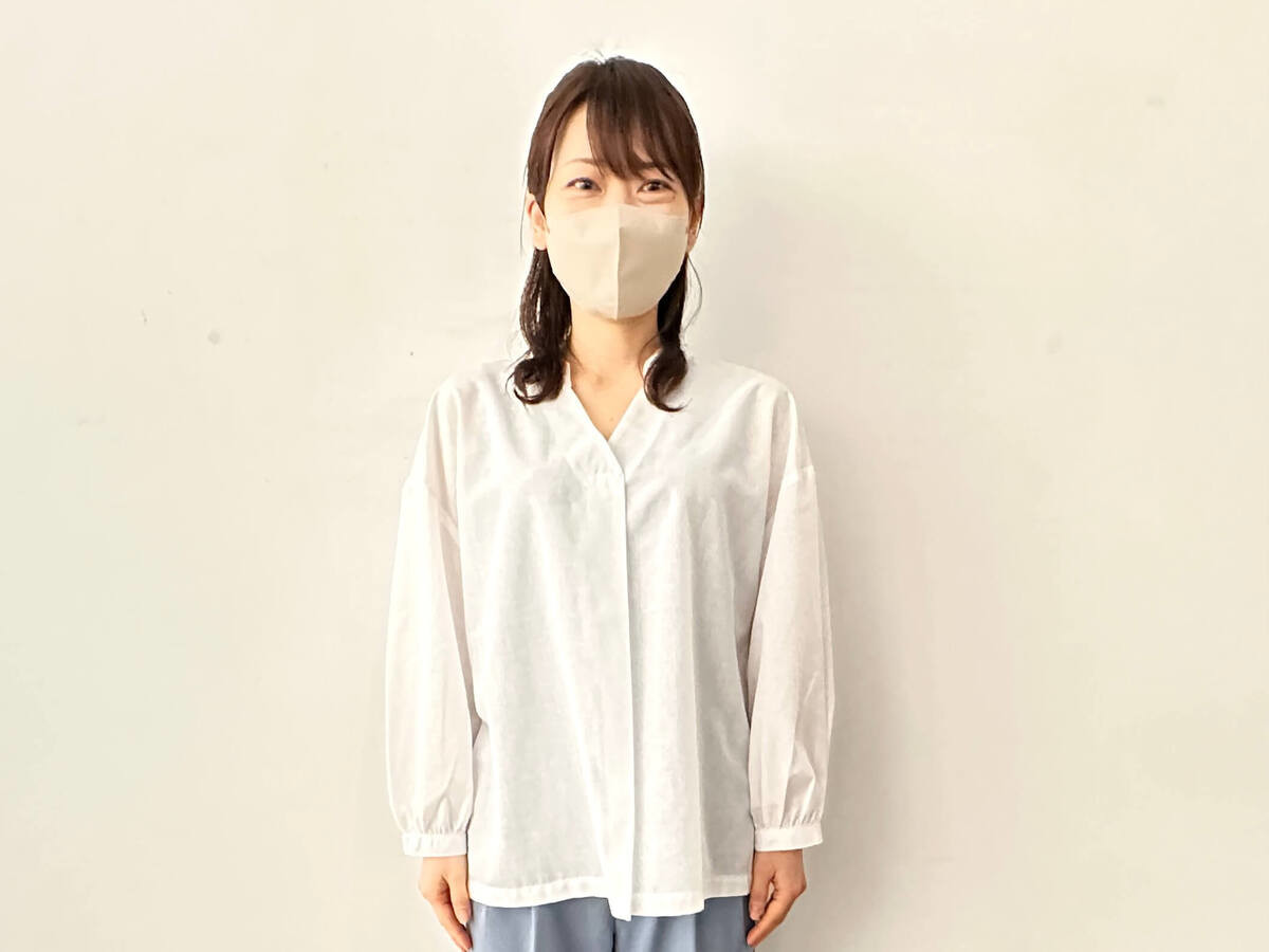 このブラウスでは、そのあたりを配慮して作られています。麻の配合割合を10%にして、やわらかさを大事に。見てわかる通り、「着られている」感じがありません。