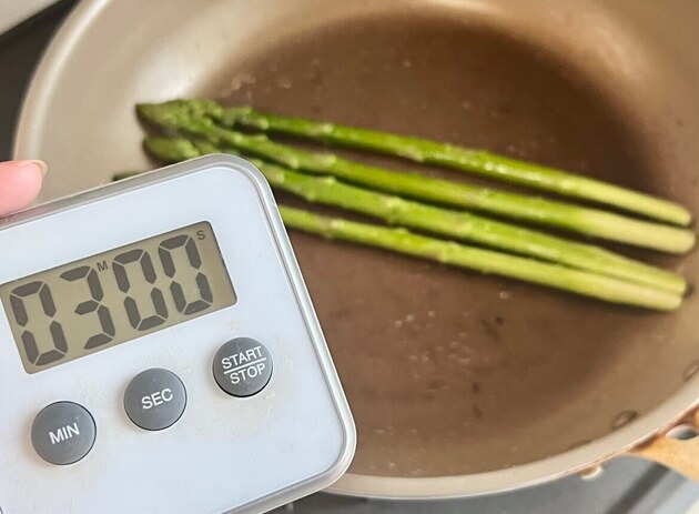 火加減は強火で3分ほど加熱するのですが、ここではアスパラガスは動かさずに焼き色をつけるのがポイント!