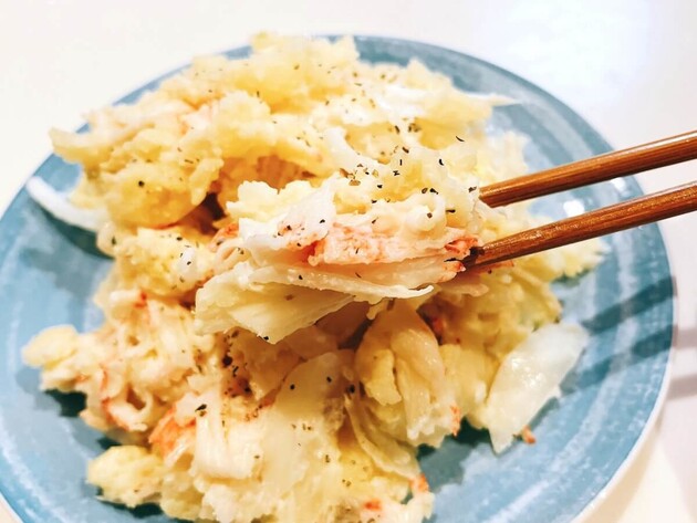 コスパの良いかにかまの旨味と、ブラックペッパーのピリリとした味わいが効いているので、味のまとまりがとても良く感じます。