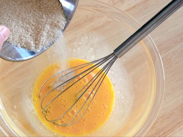 ボウルに卵を溶きほぐし、三温糖を加え、きちんと溶けるまで泡立て器でよく混ぜ合わせます。