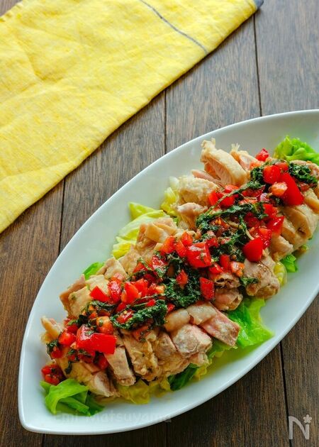 彩りが美しい、キャベツと蒸し鶏の紫蘇トマトだれです。紫蘇とトマトの組み合わせは最高に美味しくキャベツとの相性も抜群。キャベツや鶏肉は電子レンジて手軽に加熱調理ができるのも嬉しいポイント。