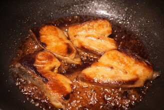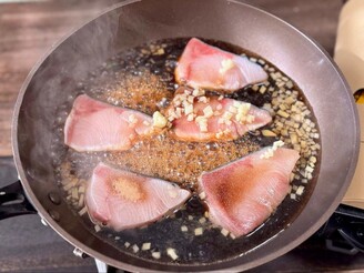切り身をフライ返しで裏返し、たれが全体になじむようにすくってかけます。