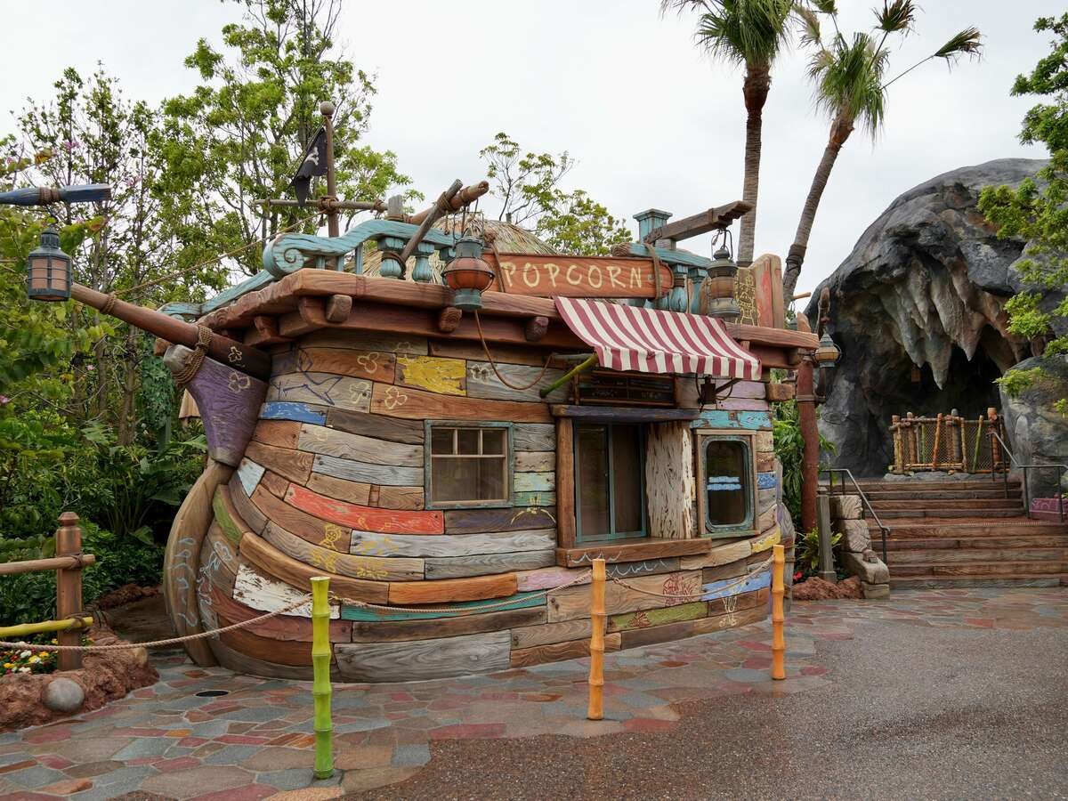 ドクロ型の岩の後ろにはポップコーンワゴンがあります。フレーバーはなんと、ビーフシチュー味!