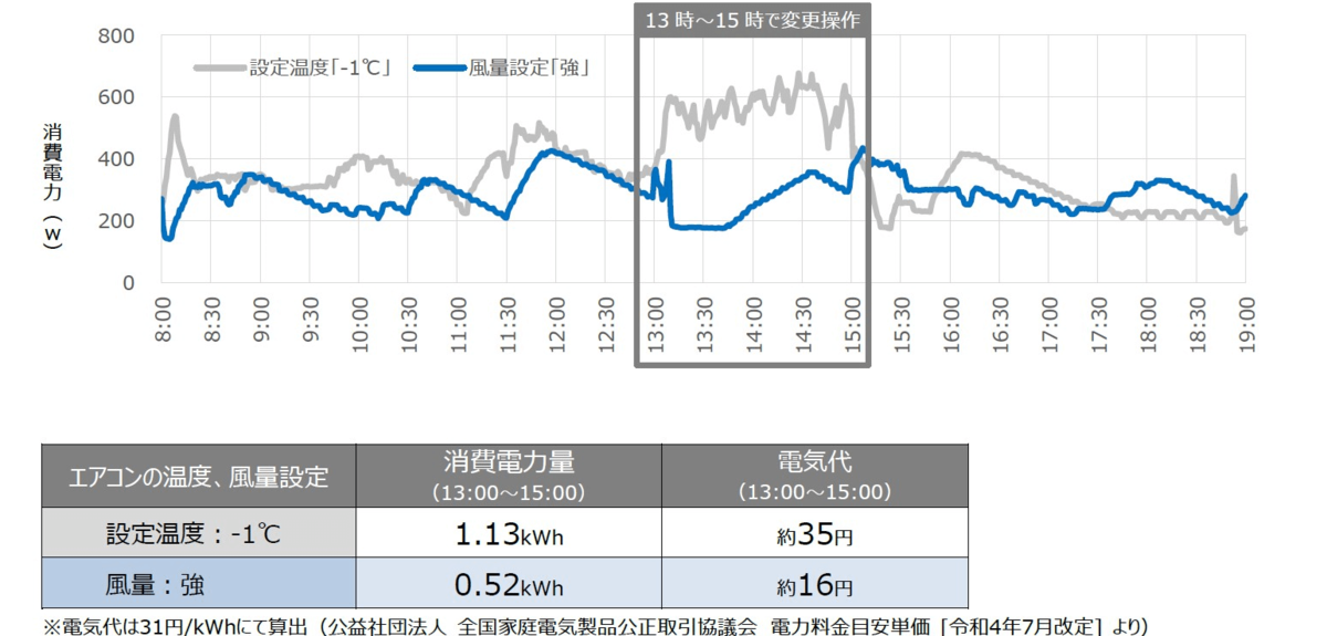 設定温度を1℃下げた場合と風量を「強」にした場合の消費電力量を比較した結果、設定温度を「1℃下げる」と1.13kWh、風量「強」にすると0.52kWh となります。