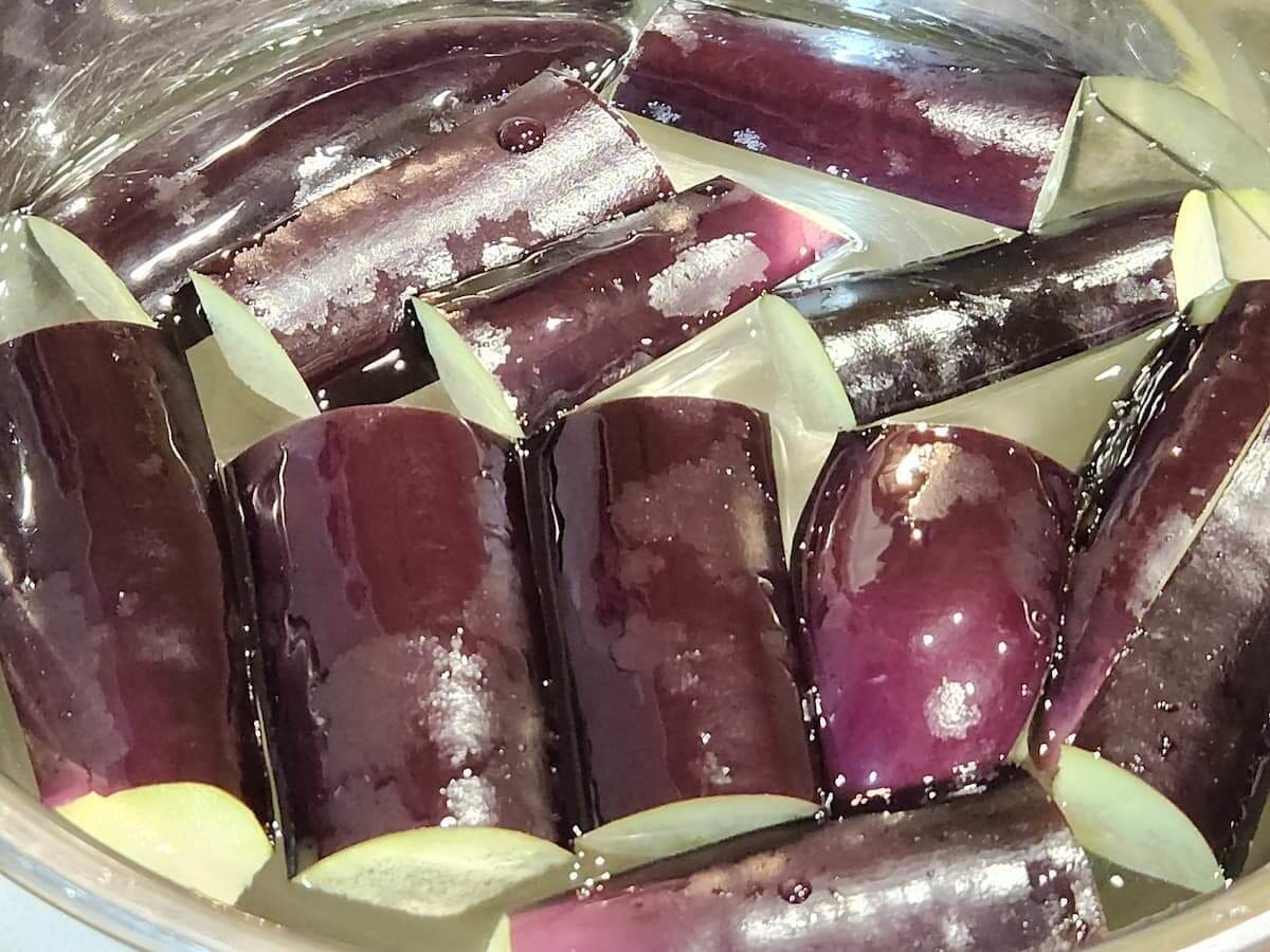 ナスは水につけると浮いてくるのでたまにかき混ぜると良いですよ。