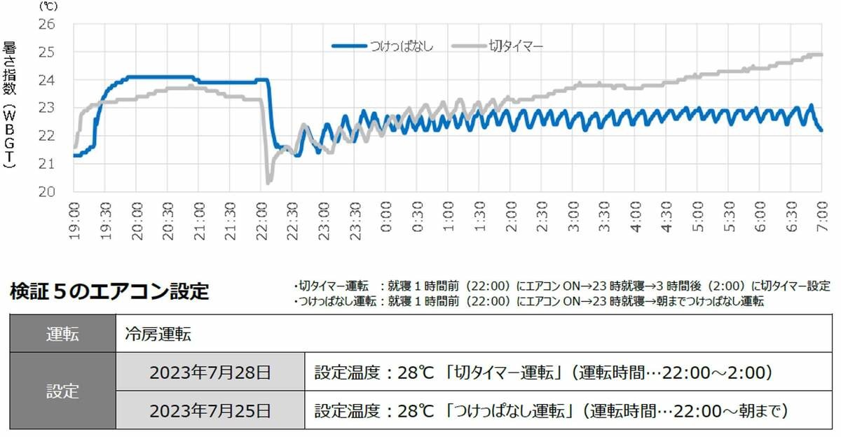 一方のタイマー運転では暑さ指数(WBGT)は、明け方には熱中症への警戒が必要とされる25℃近くにまで達しました。