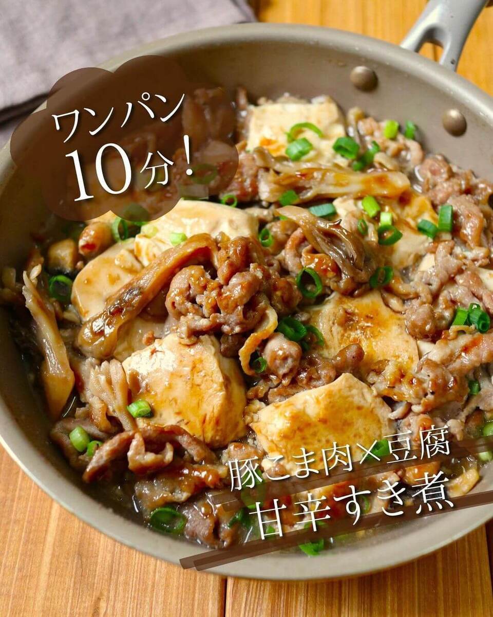 「豚こま肉と豆腐のすき煮」は豆腐の水切りも不要で、時短なのに味がしみしみの絶品料理。フライパンであっという間につくれるうえに、作り置きにもおすすめとのことです!