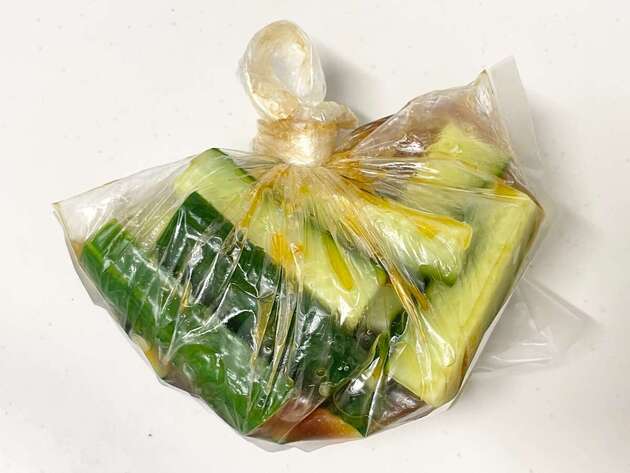 ①も入れてよく揉み込んだら空気を抜き、冷蔵室で1時間程度漬けます。